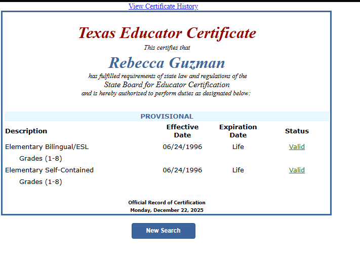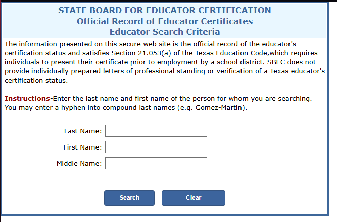 Step 2: Visit https://tealprod.tea.state.tx.us/ECOS-External/EcosOnline/VirtCert/ and enter the First Name and Last Name to retrieve information, then click Search.